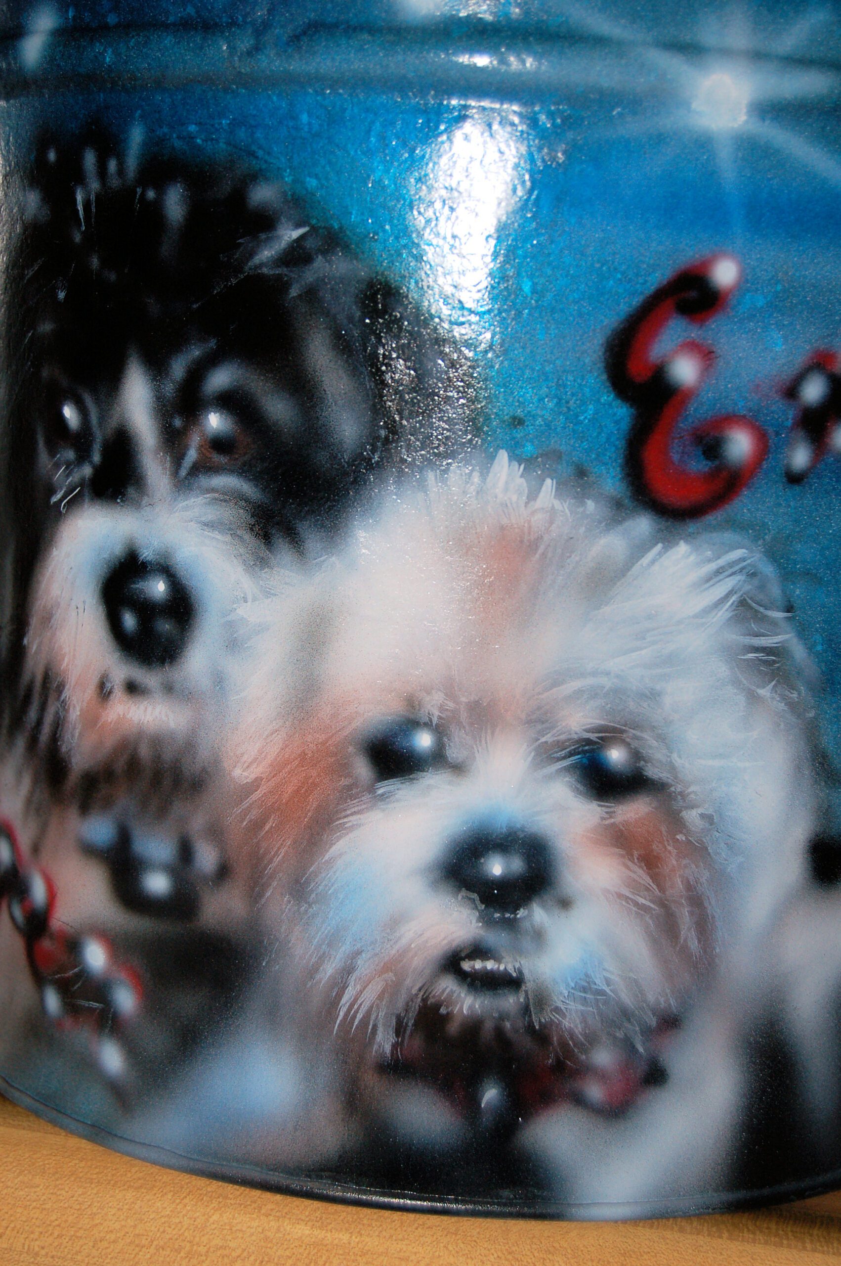 This custom pet painting features a painted depiction of a black and white dog on a barn pail. The dog’s detailed facial features—its eyes, nose, and mouth—give it a realistic look, while the surrounding red and black decorative elements add an artistic touch.