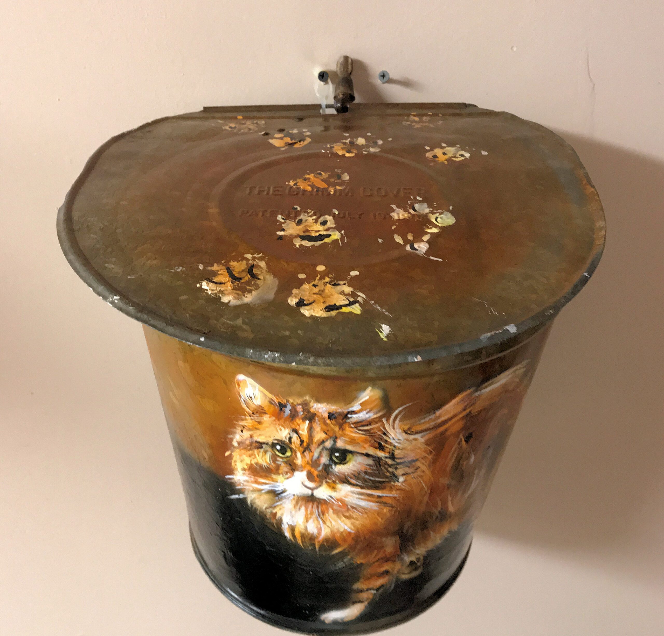 The antique bucket lid has a charming touch—several painted cat paw prints are scattered across its surface, adding to its whimsical appeal. The embossed text on the lid, “THE GEM COVER PAT’D JULY 19 10,” gives it historical significance, suggesting it dates back to the early 20th century. The way it’s mounted on the wall makes it more than just a practical object—it’s now part of a creative display.