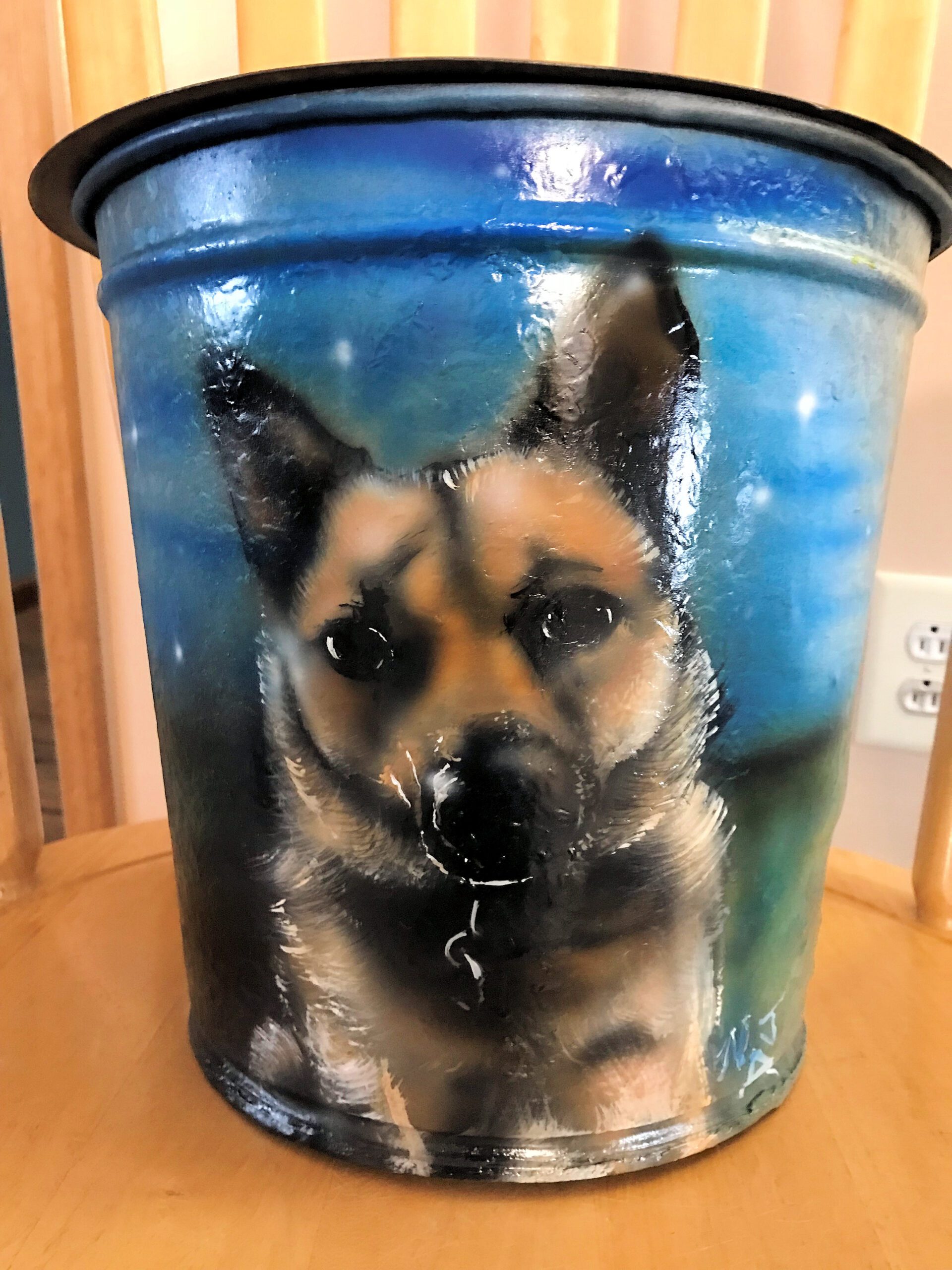 This barn pail features a carefully painted German Shepherd, capturing the breed’s distinct features—its sharp, attentive eyes, textured fur, and confident expression. The blue background provides a nice contrast to the detailed brushwork of the dog’s fur, making it stand out prominently.