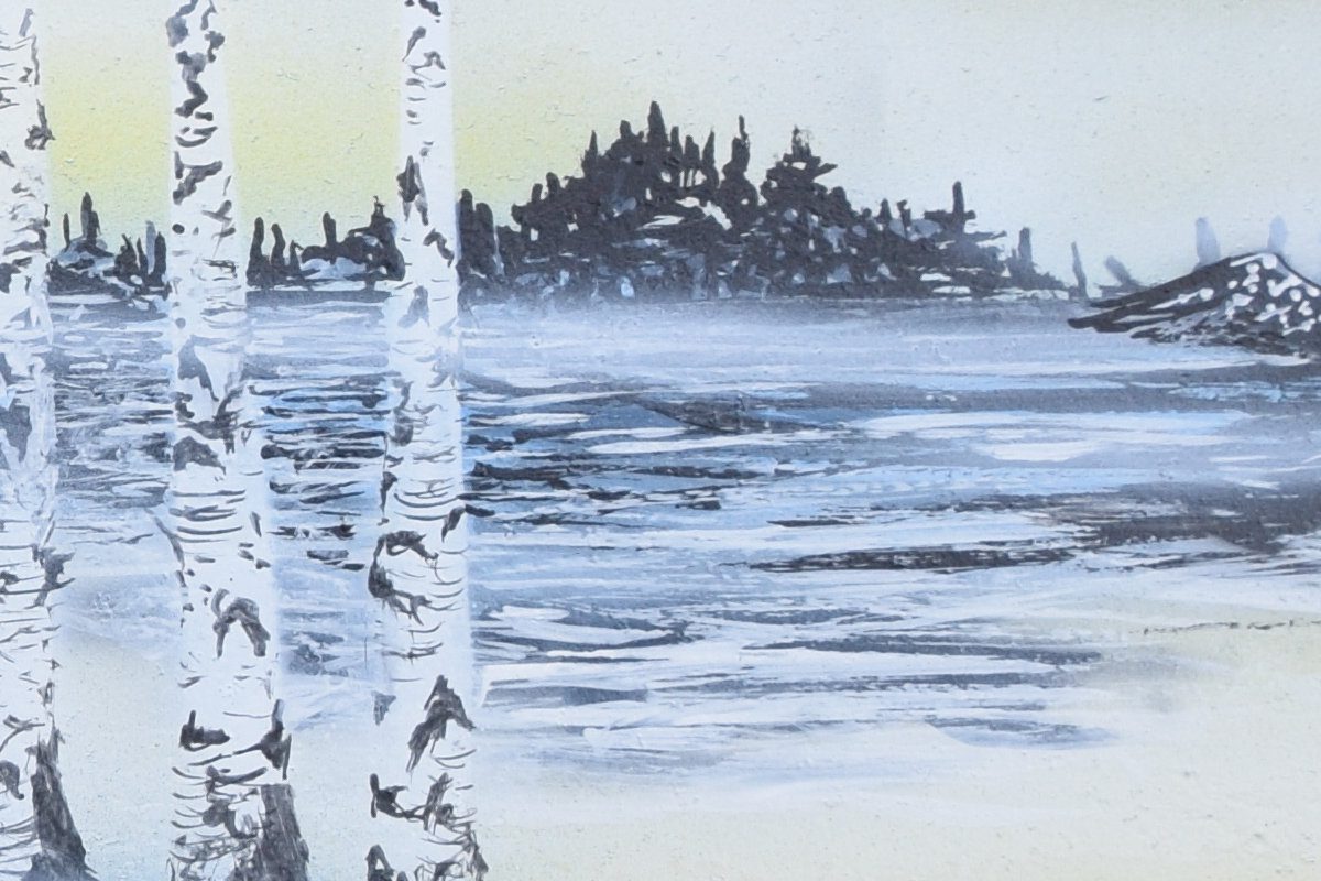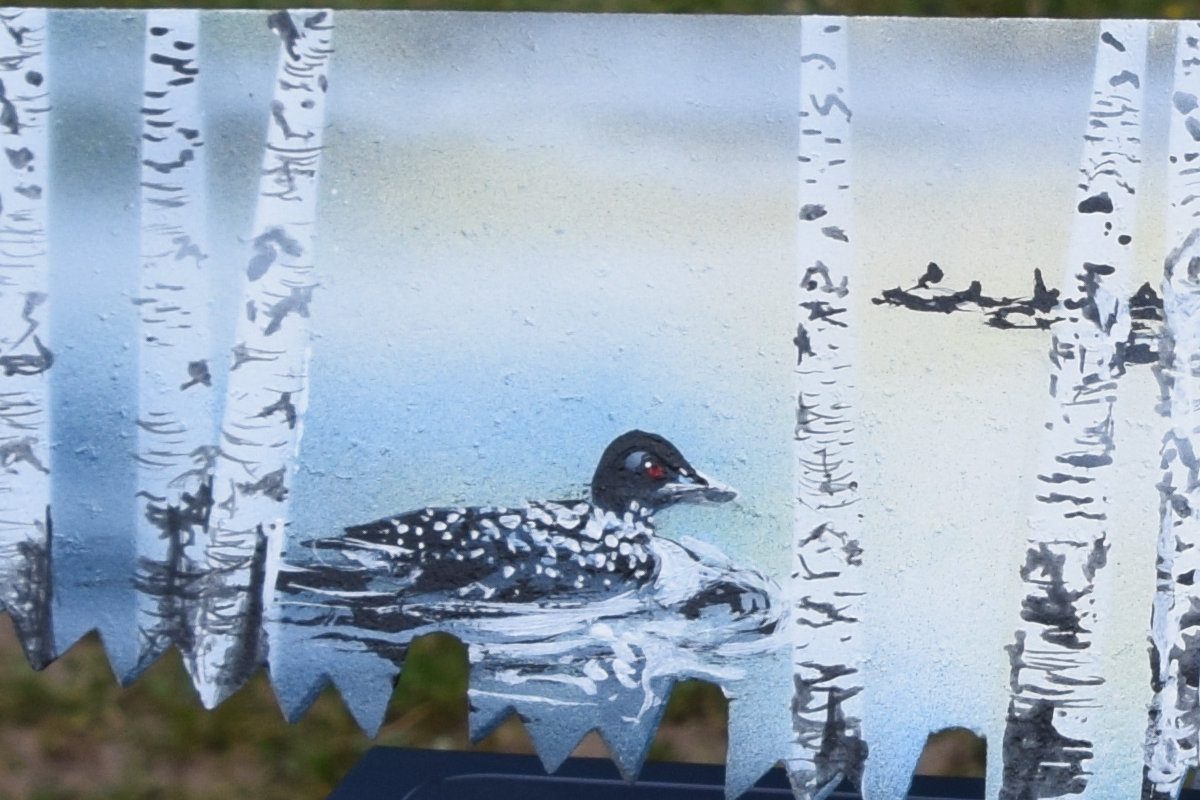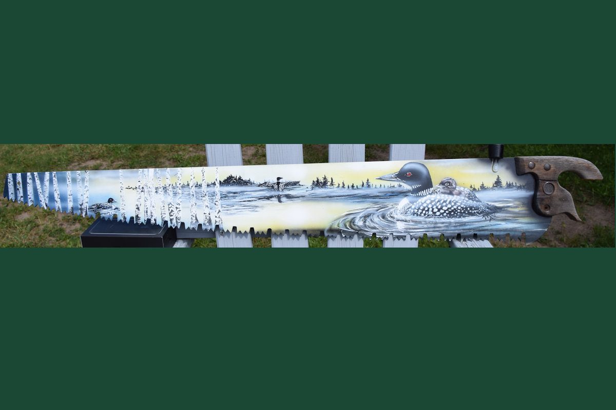 “Loons on Antique Hand Saw.” This unique Adirondack Art item features a hand-painted saw showing 3 Loons at sunrise on an Adirondack misty pond with birch trees in the foreground.