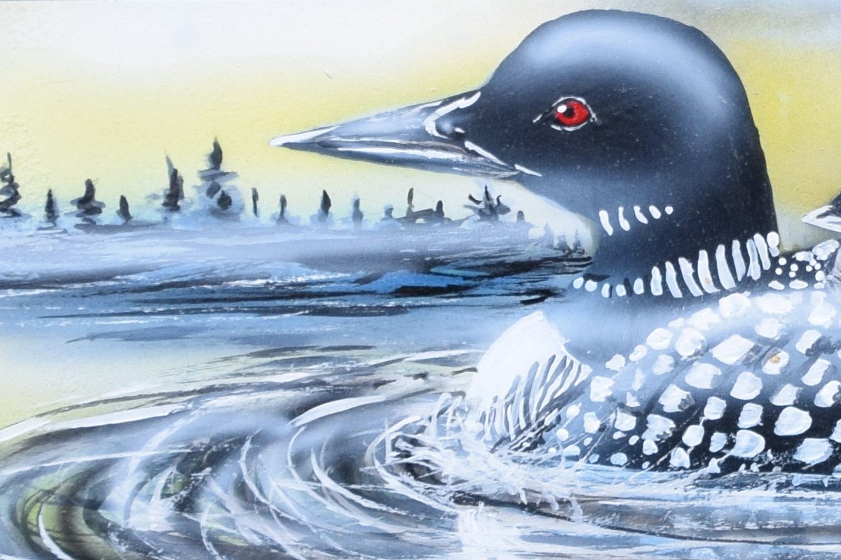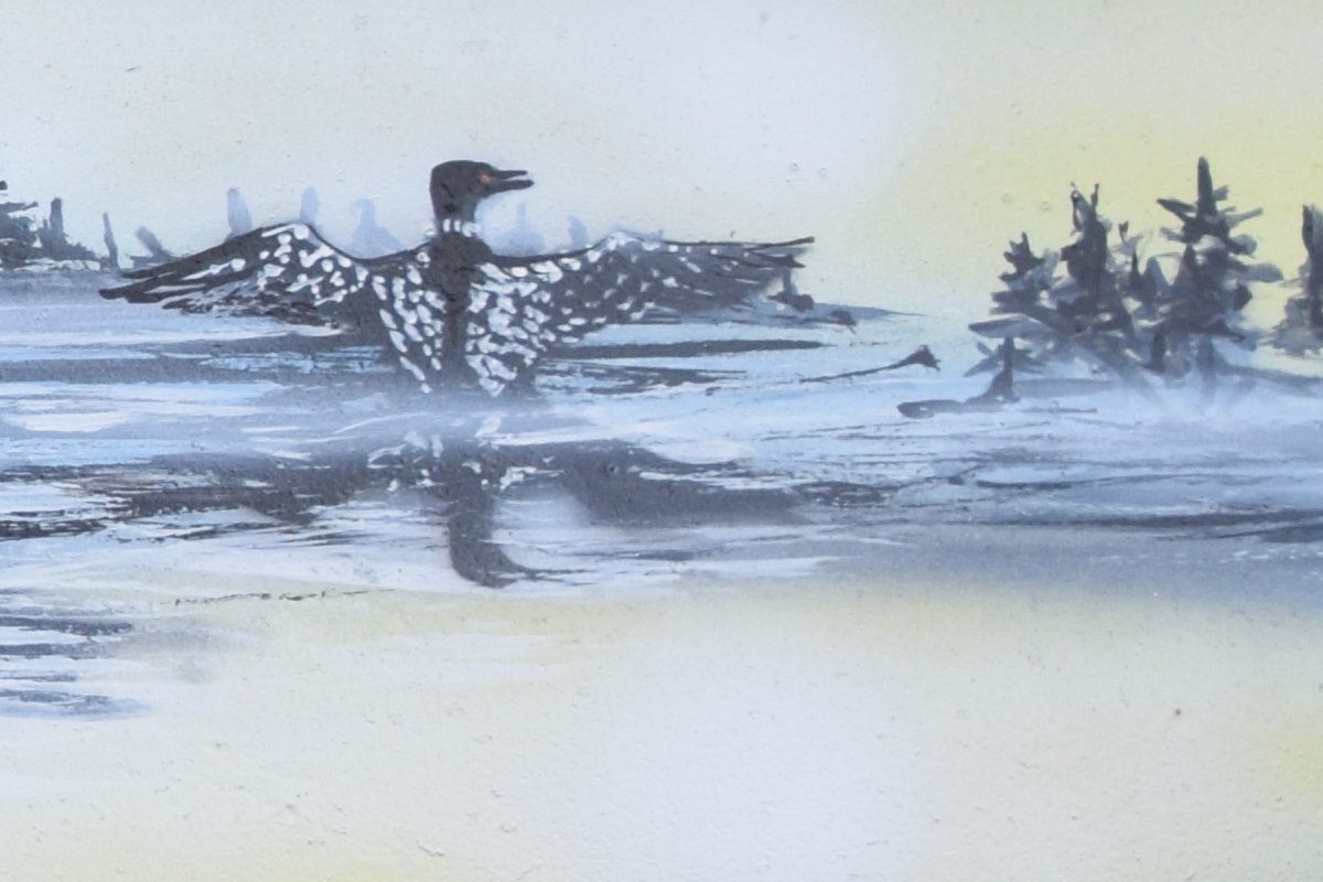 The loons are beautifully detailed, capturing their distinctive black and white plumage.