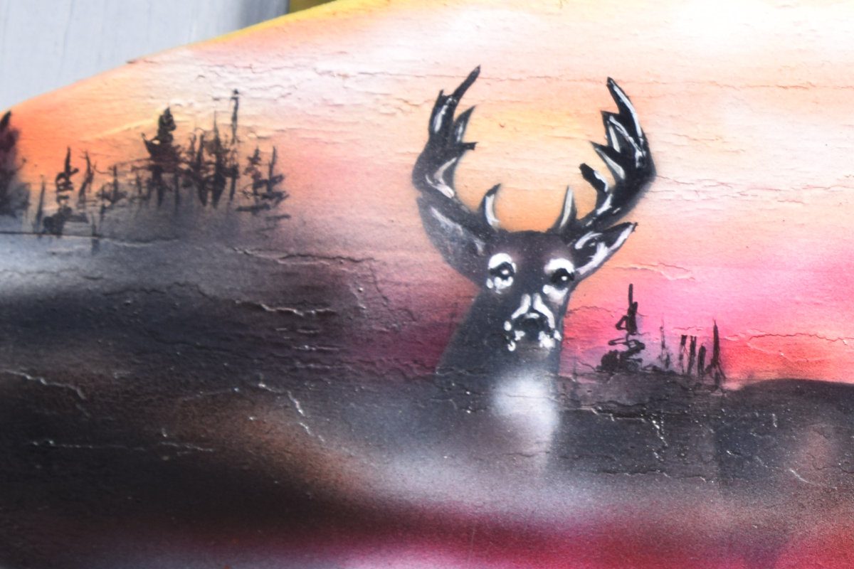 “Whitetail Pursuit.” This Adirondack artwork features three bucks on a paddle in pursuit of a doe, with the doe on the handle eluding them.