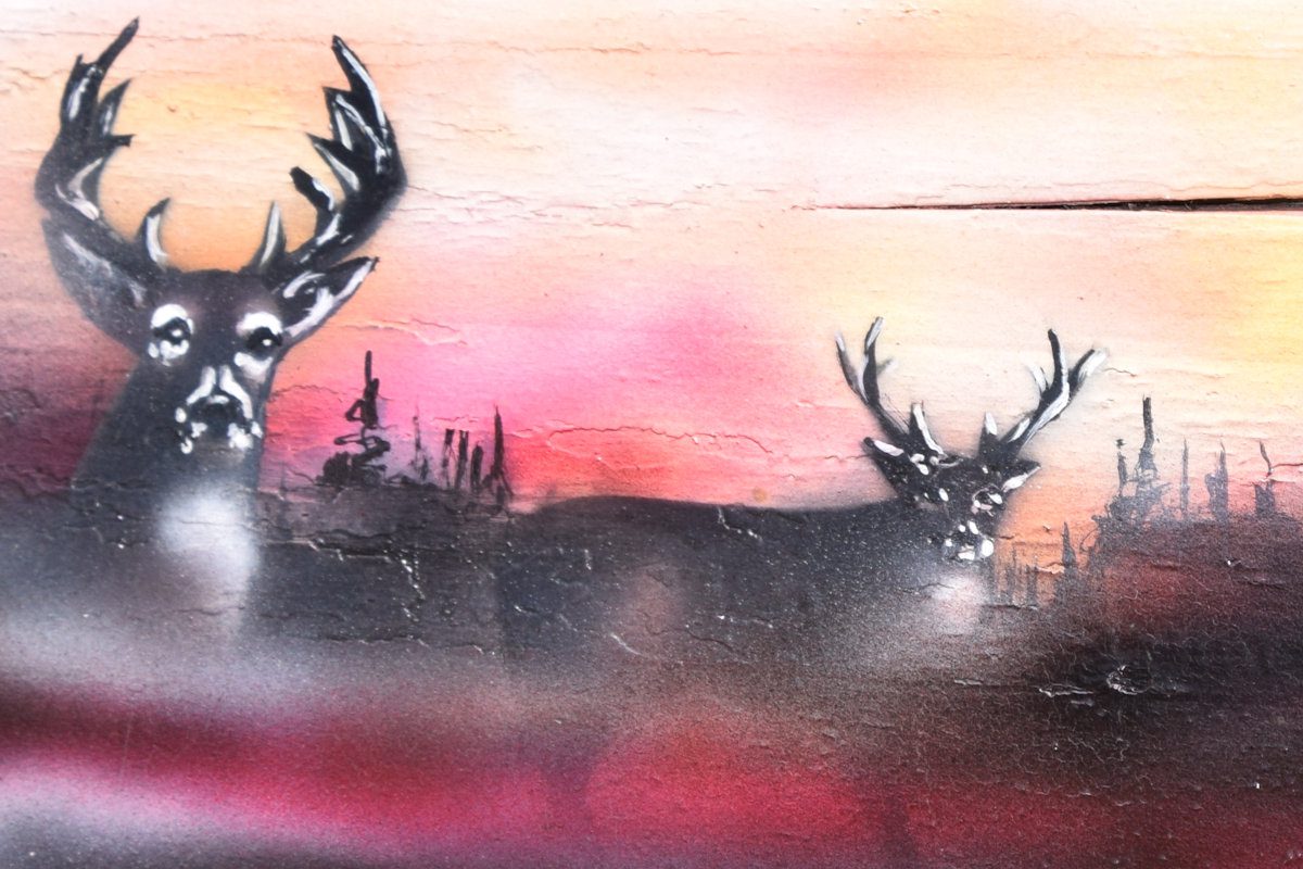 The handle shows a detailed painting of a deer’s head. The deer has large, dark eyes and prominent ears, set against a stylized background.