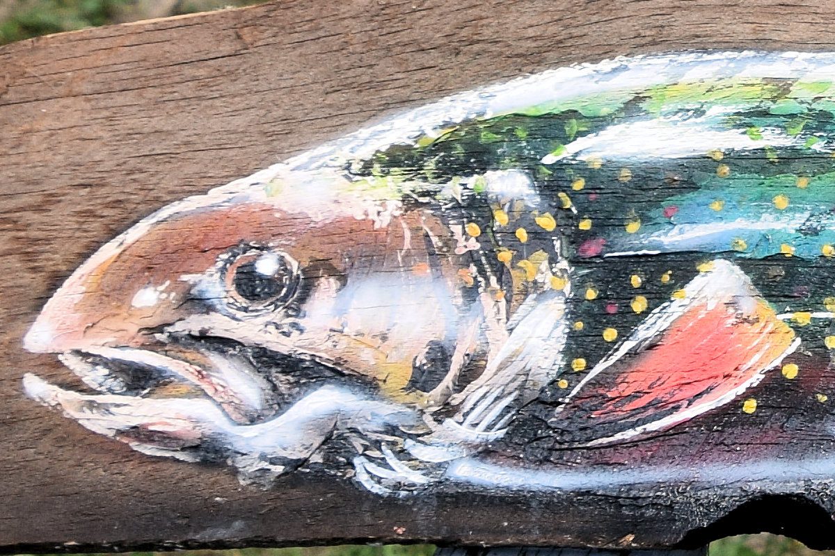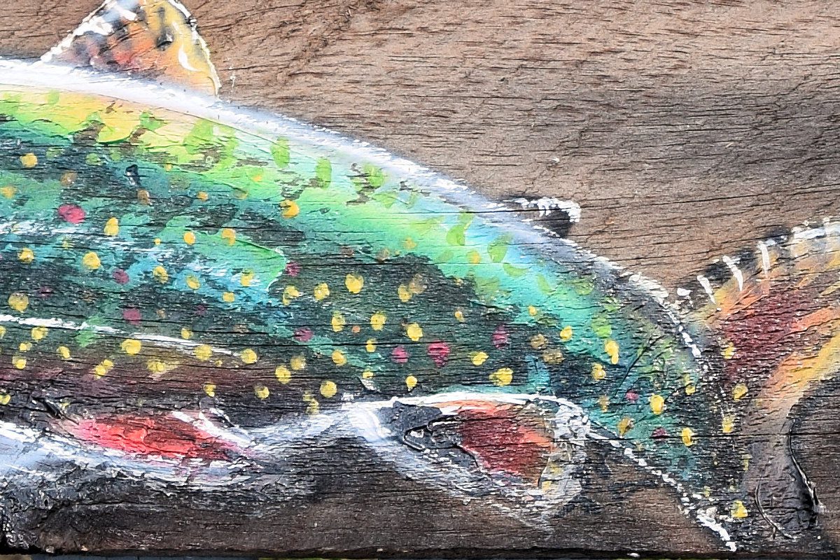 “Rustic Fly Shop Sign.” This Adirondack Art sign is painted on an authentic barn board from an old Adirondack saw mill. A colorful illustration of a trout is on the left side.