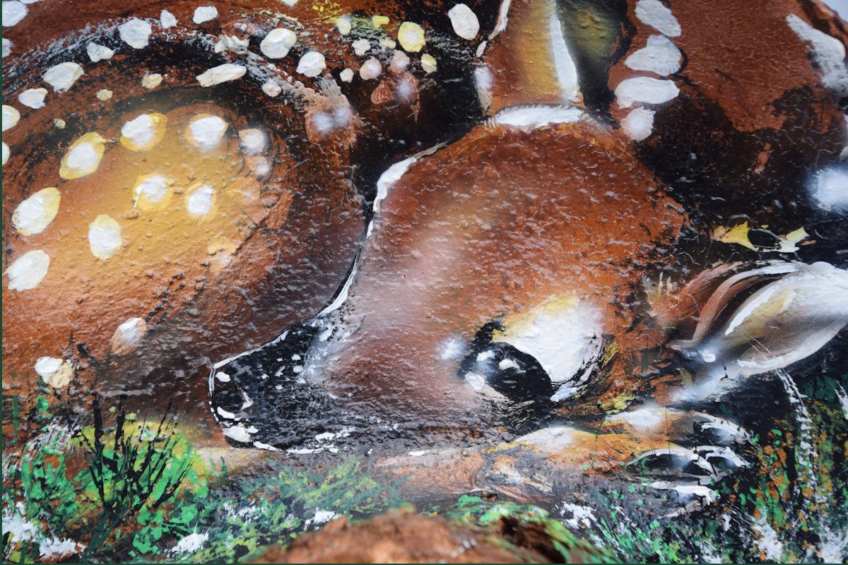 The painting captures the fawn in detail, with brown and white tones highlighting its spotted fur.