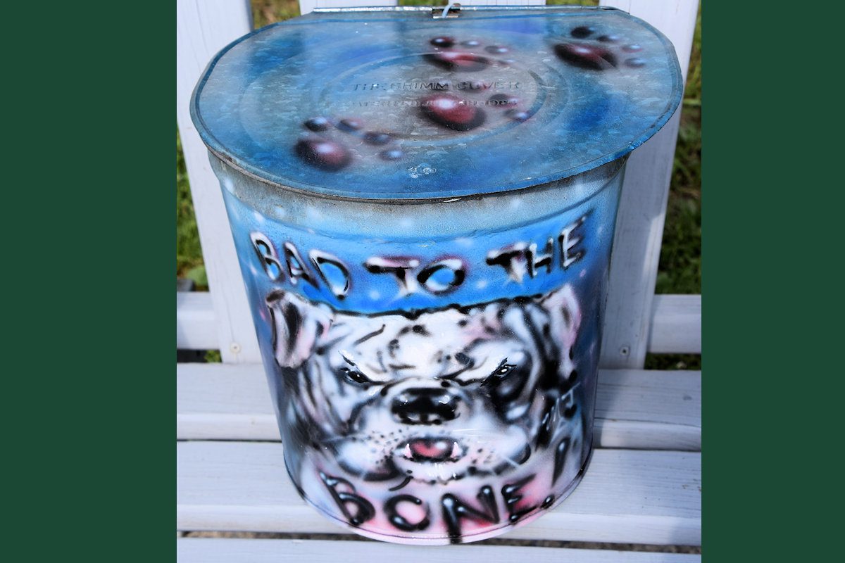 “Bad to the Bone with Bulldog portrait.” This Adirondack Art features a painting of a bulldog on an antique Grimm sap bucket. Perfect for a biscuit can.