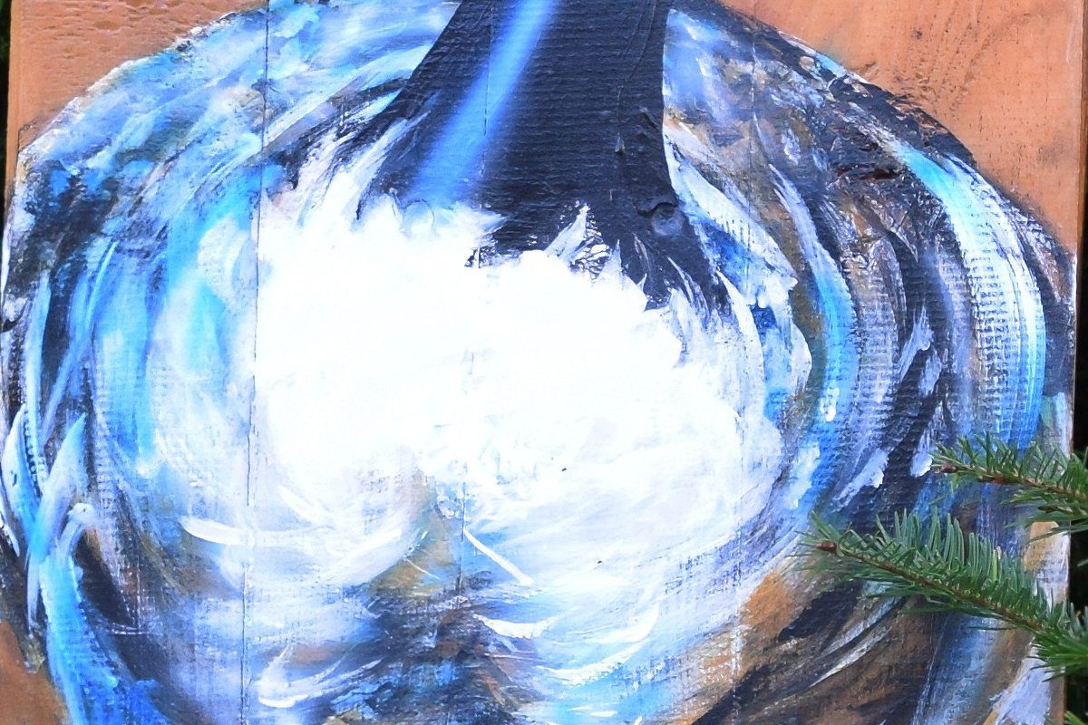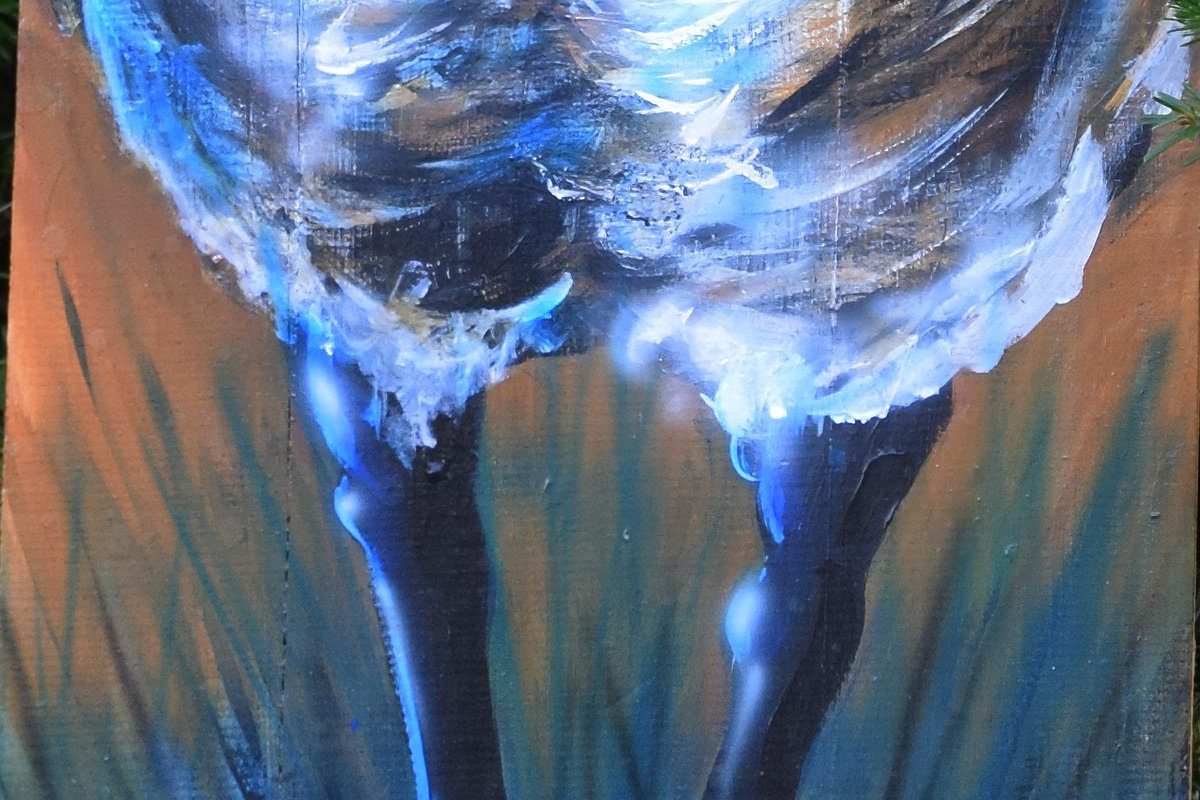 The ironing board has been smoothly sanded and its natural wood grain and knots of the board are visible around the painted area, adding texture and an organic feel to the artwork.