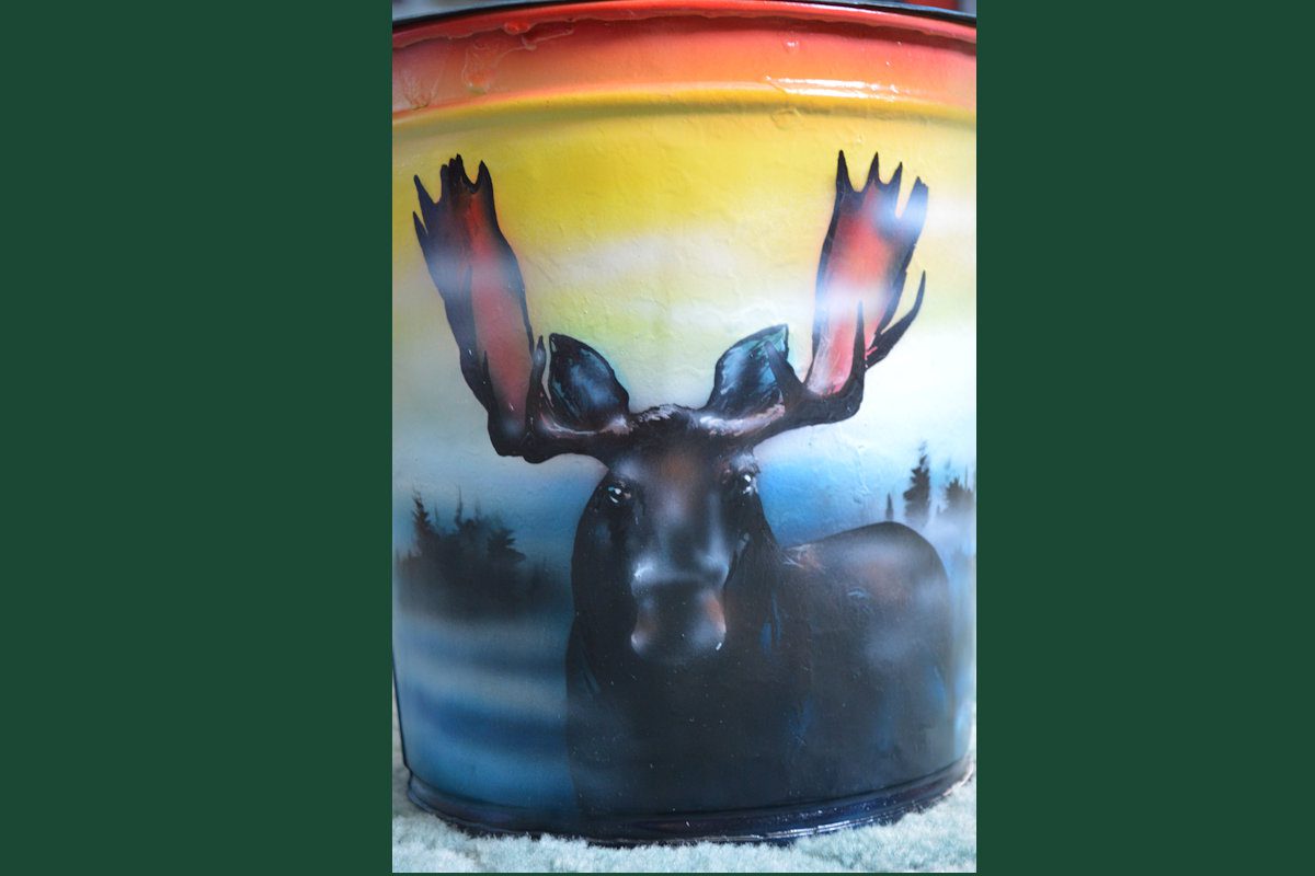 Discover the rustic charm of our hand-painted moose on an antique sap bucket, set against the warm, glowing backdrop of a sunset.
