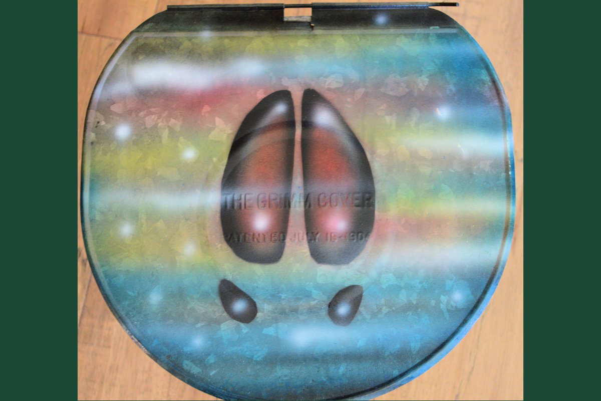 The lid is unique and visually striking. It features a colorful design that mimics a natural environment, with green and blue hues resembling a forest floor or mossy ground.